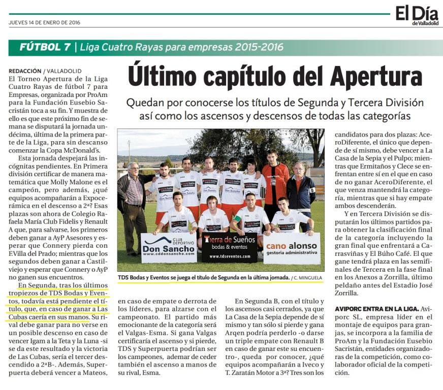 Y como no podía ser de otra forma, Centro Deportivo Don Sancho, un año más apoyando a Tierra de Sueños Bodas & Eventos en la mejor liga de futbol amateur de Valladolid. Este año, al habernos proclamado campeones de segunda en el torneo apertura que acaba de terminar, ascendemos a Primera División, y gracias al título tenemos plaza directa en semifinales del torneo clausura a final de temporada en los anexos del Estadio José Zorrilla. Tenemos muchas esperanzas en ganar dicho partido para estar un año más jugando la final del torneo clausura en el Estadio Jose Zorrilla!!!